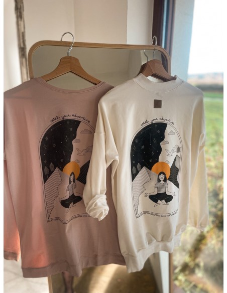 W tyle niewyczuwalny nadruk DTG, bezpieczny dla skóry. Obrazek narysowała dla nas Ania Janik, zwracając szczególnie uwagę na motyw górski, naturę, niebo, słońce, przypominając o naszym koncepcie, który zachęca do zwolnienia i szukania balansu.