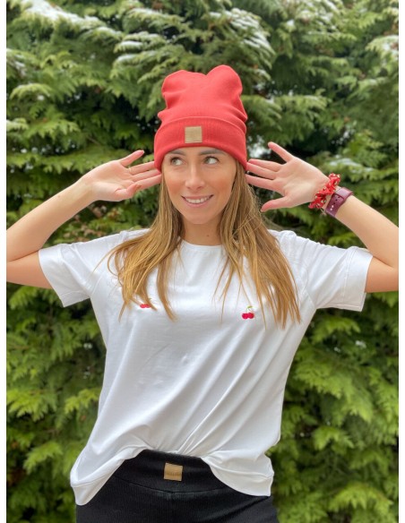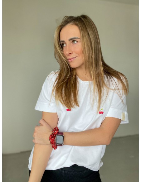 Forma koszulki delikatnie oversizowa. Na przodzie aplikacja dwóch wisienek. Wykończona księżycowymi metkami.