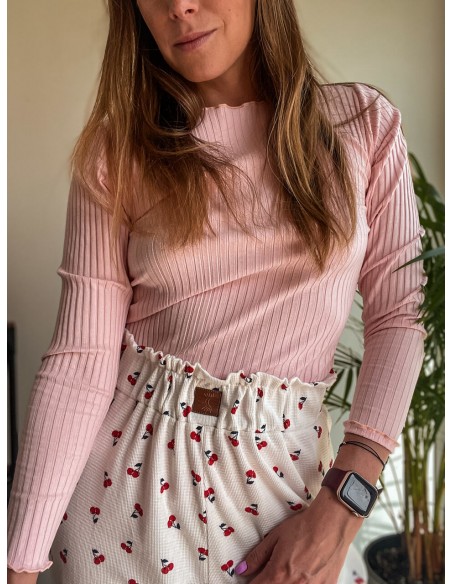 Spodnie mają wydłużony stan, wykończony gumką z falbanką, której zadaniem jest wysmuklenie talii. Możesz nosić je wysoko w połączeniu z topem czy strojem kąpielowym bądź nisko, na biodrach.