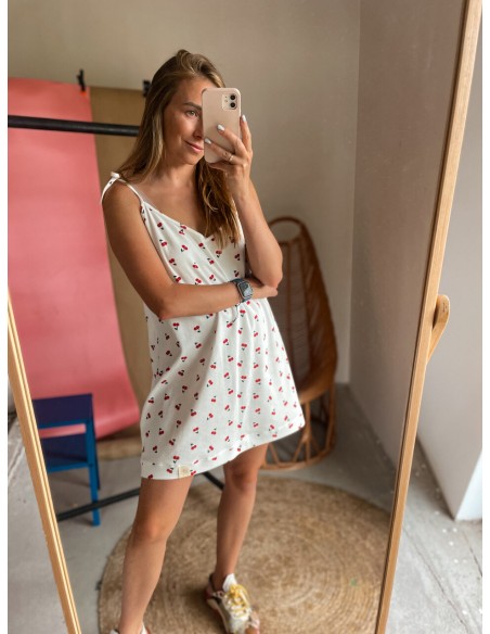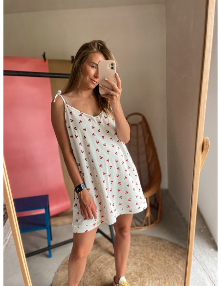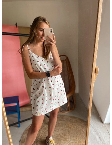 Sukienka, której krój dopasuje się do każdej sylwetki. Model oversize, możesz nosić puszczoną luźno, bądź przewiązaną w pasie. Naramki wiązane, dzięki czemu w prosty sposób regulujesz jej długość.