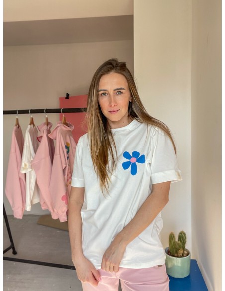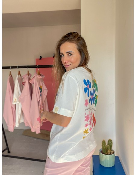 Tshirt wykonany z grubszej, mięsistej bawełny. Kolor złamanej bieli, delikatnie śmietankowej. Forma prosta, delikatnie oversizowa. W górze wykończony ściągaczem.