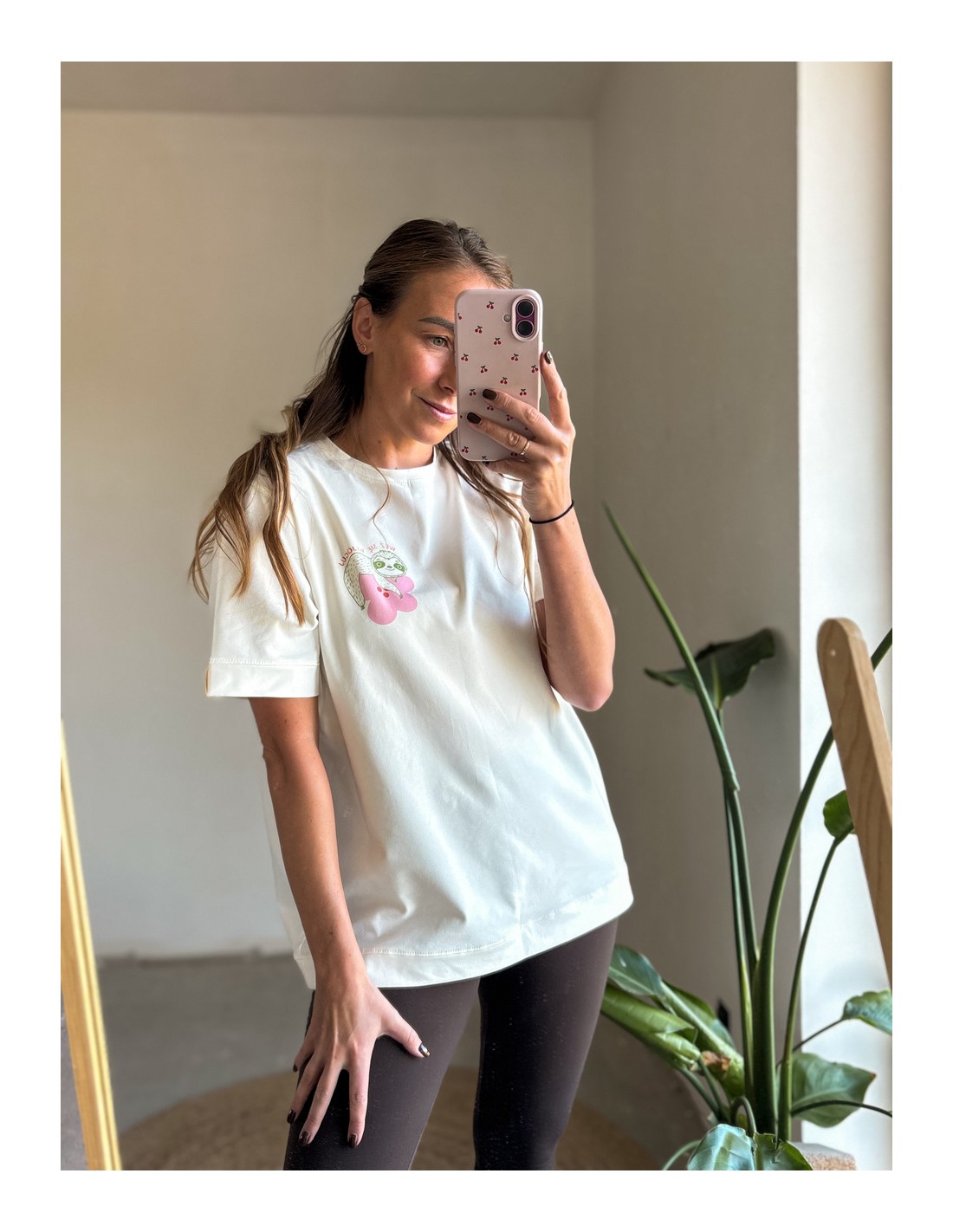 Na piersi rysunek zaprojektowany przez Ankę Janik. Leniwiec ma zachęcić do wylogowania się, łapiąc głębszy oddech na macie.